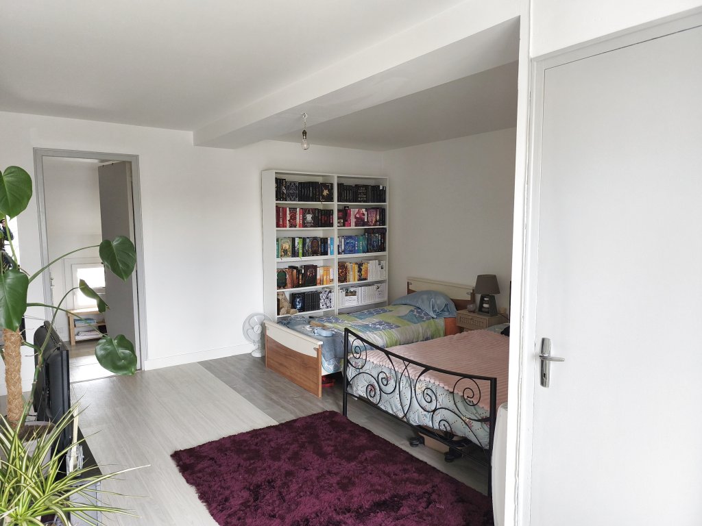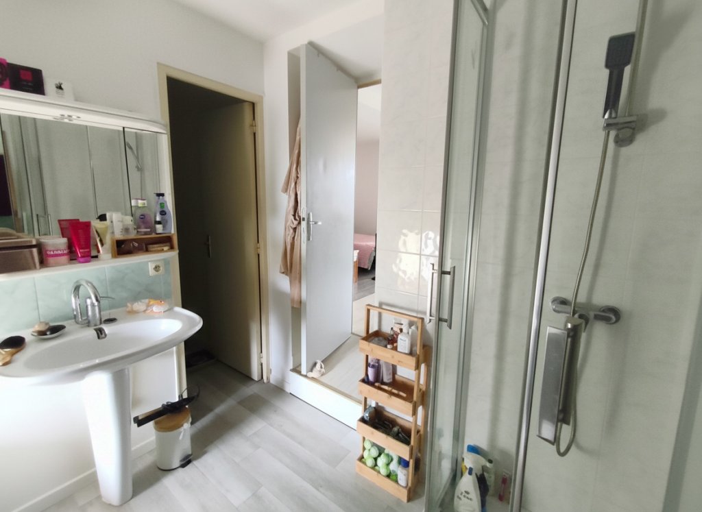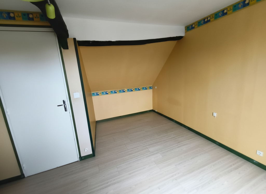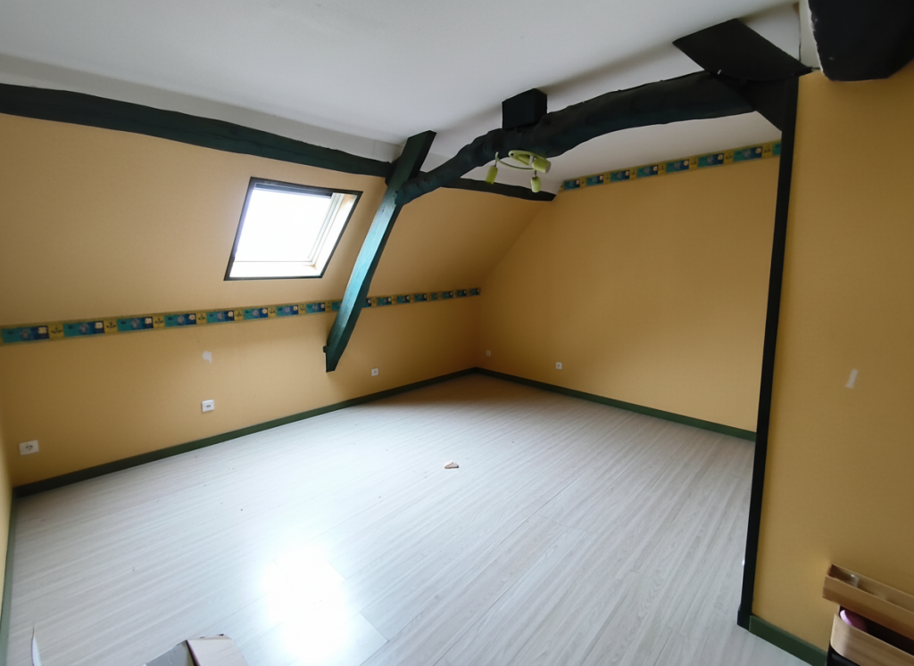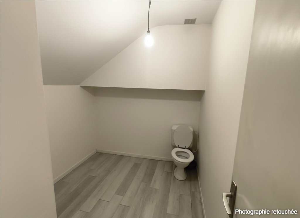 A l’étage : une vaste de chambre de presque 19m2, une salle d’eau et un second WC indépendant servant de buanderie.