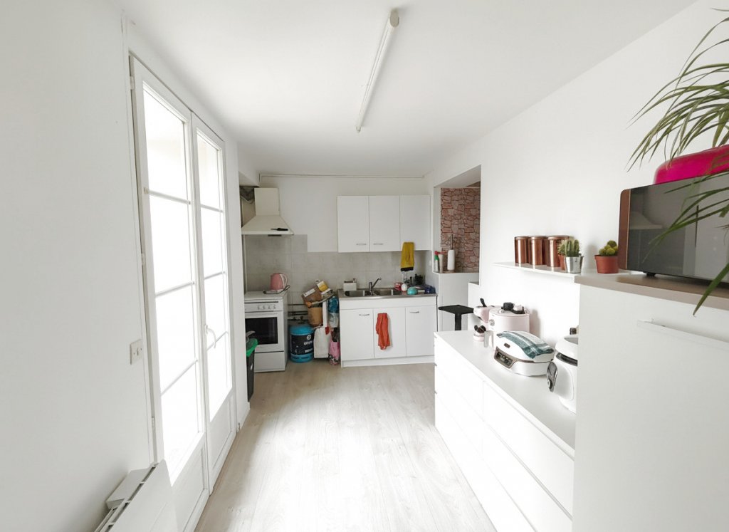 La maison se compose d’un salon/séjour disposant d’un débarras et d’un wc indépendant, et d’une cuisine avec un accès direct sur la cour avec cabanon,