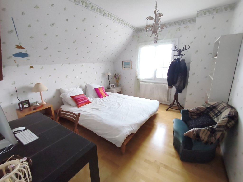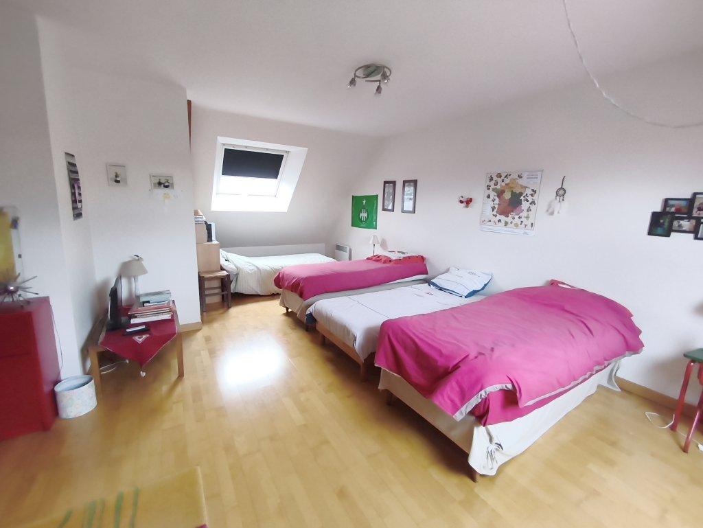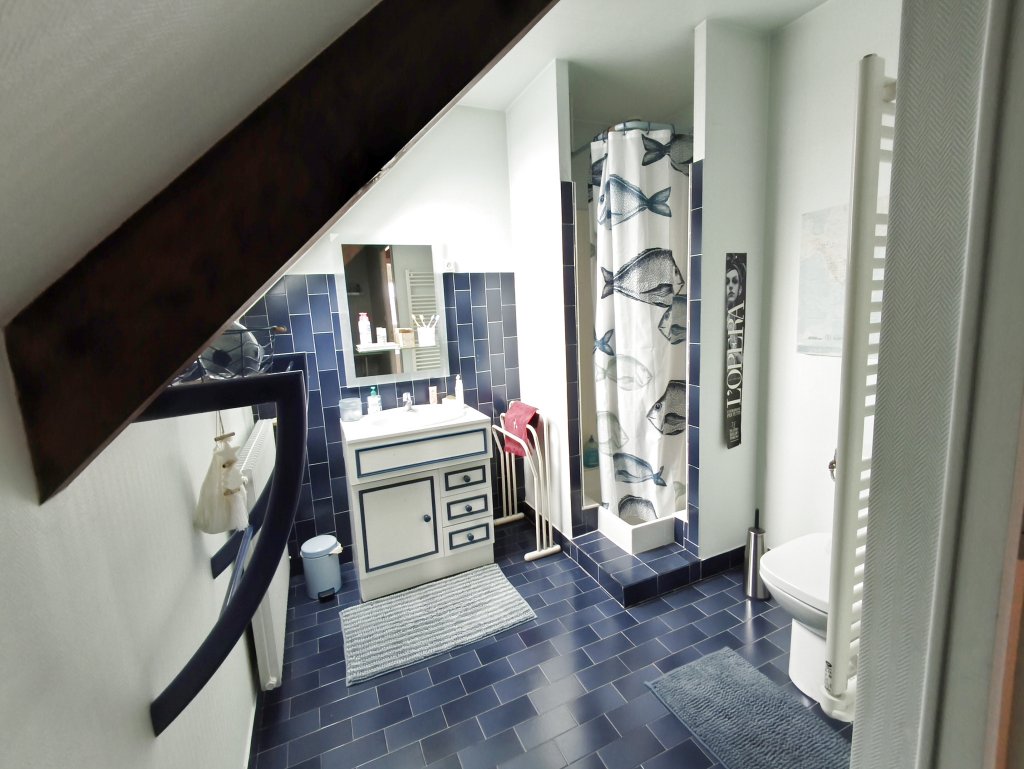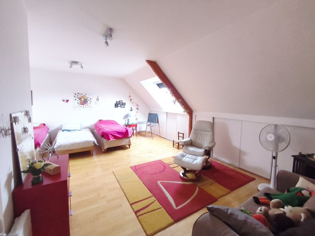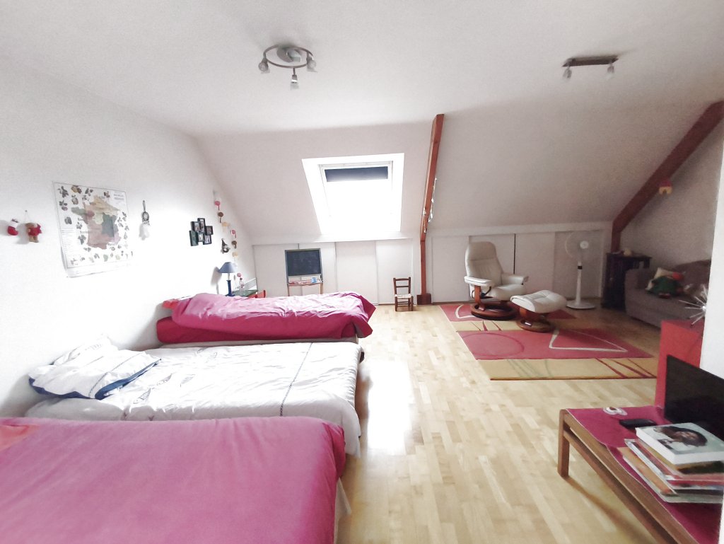 A l’étage, le palier dessert deux chambres et une salle d’eau avec WC, ainsi qu’un vaste dortoir de presque 36m2 permettant la création d’une suite parentale.