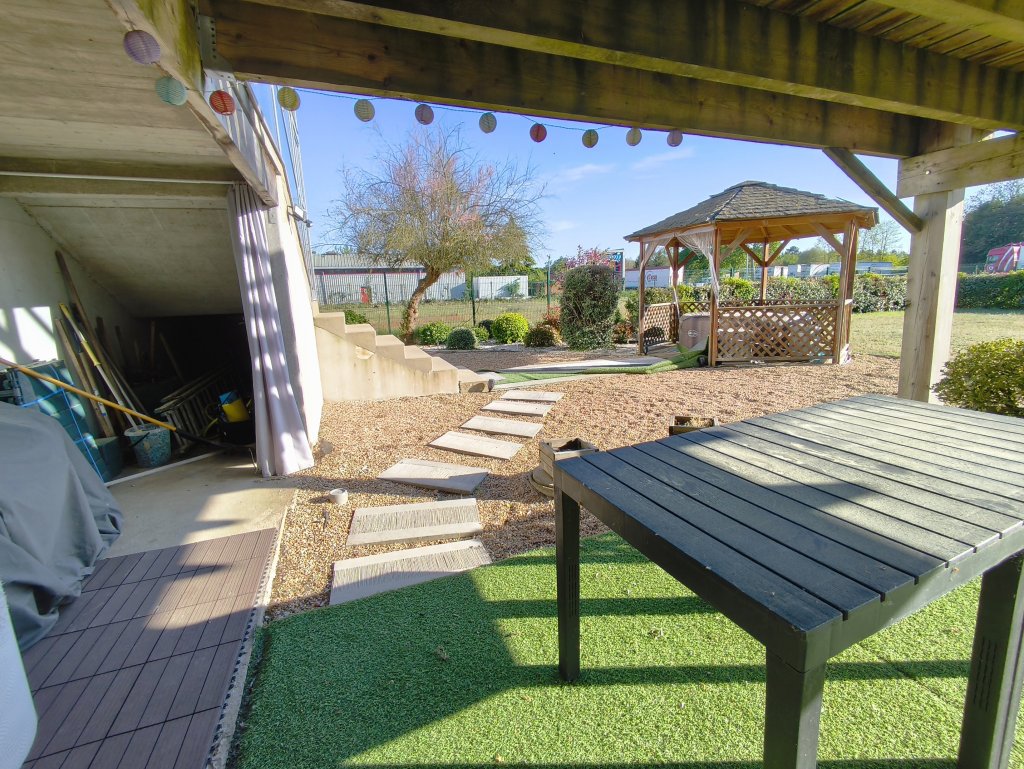 Le garage donne accès à la cour ainsi qu’à une seconde terrasse, un kiosque et au jardin entièrement clos.