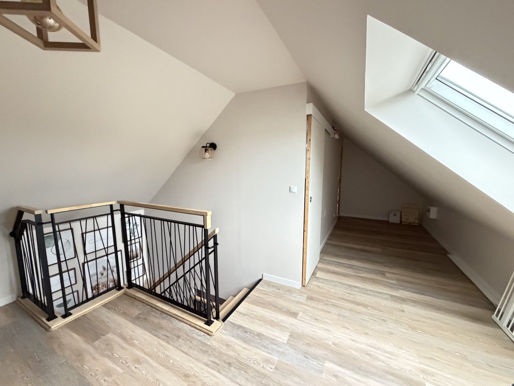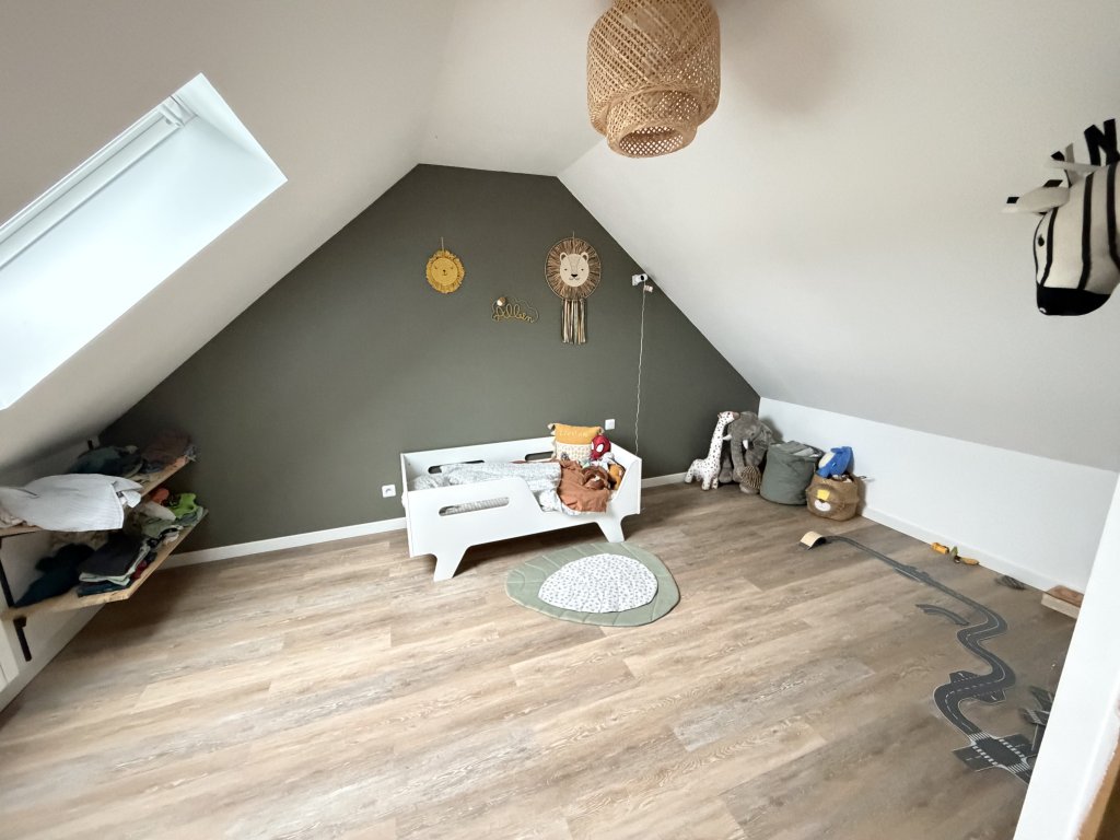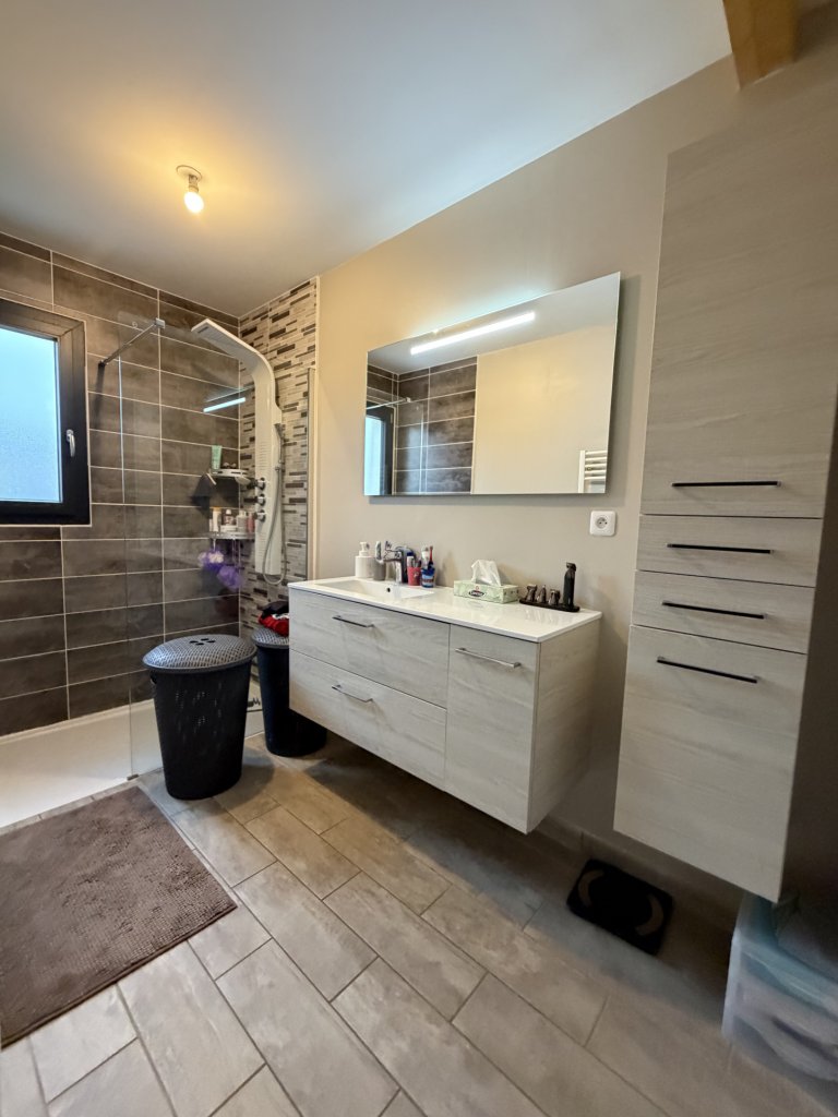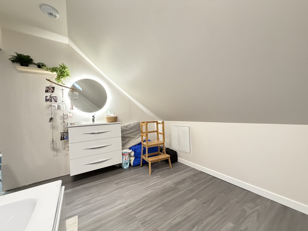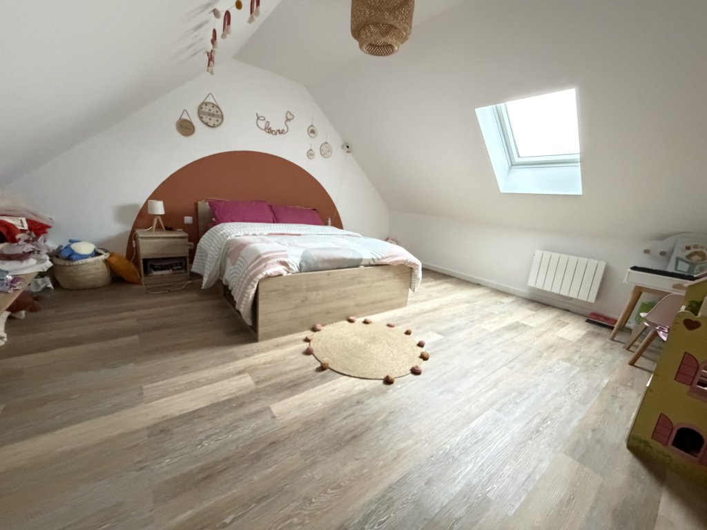 À l’étage, deux chambres supplémentaires, un palier aménageable et une salle de bains avec WC, pour un confort familial apprécié.