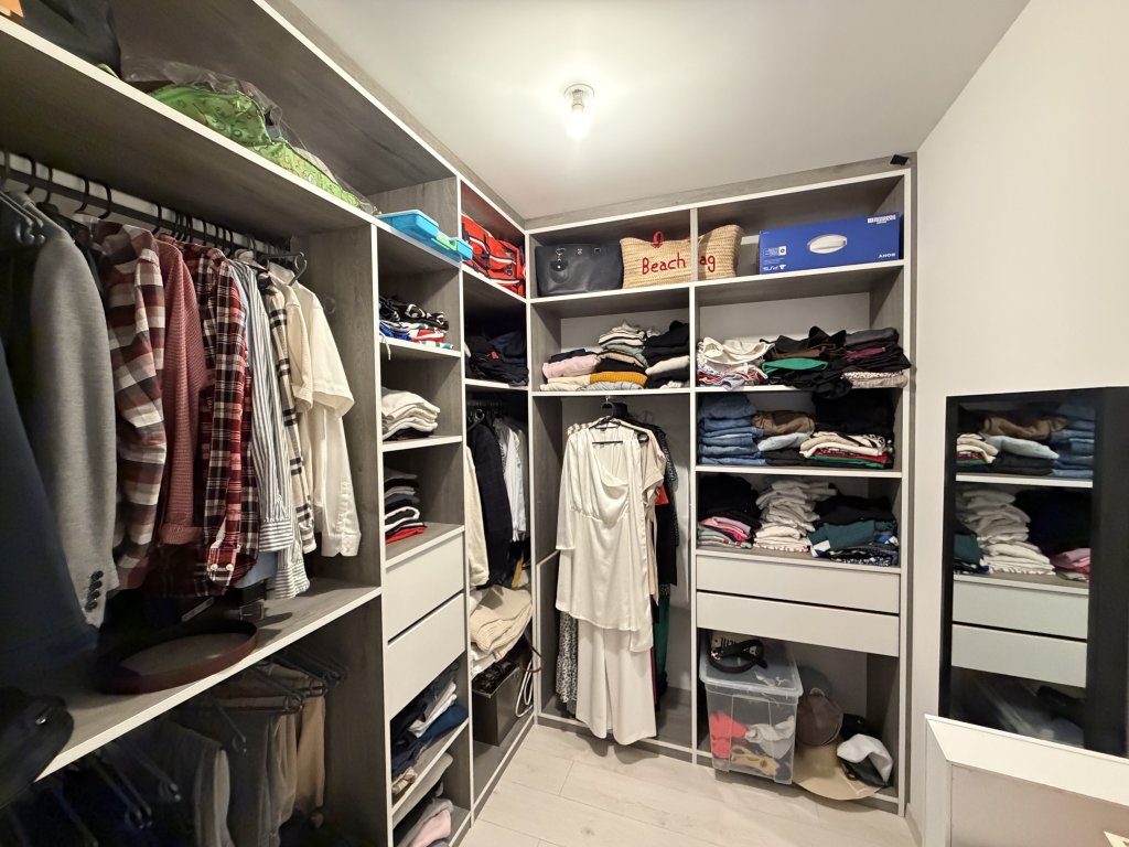 Au rez-de-chaussée, deux chambres dont une suite parentale avec dressing, une grande salle de bains avec douche et une pièce de vie lumineuse ouverte sur une cuisine équipée, offrant un espace convivial et fonctionnel.