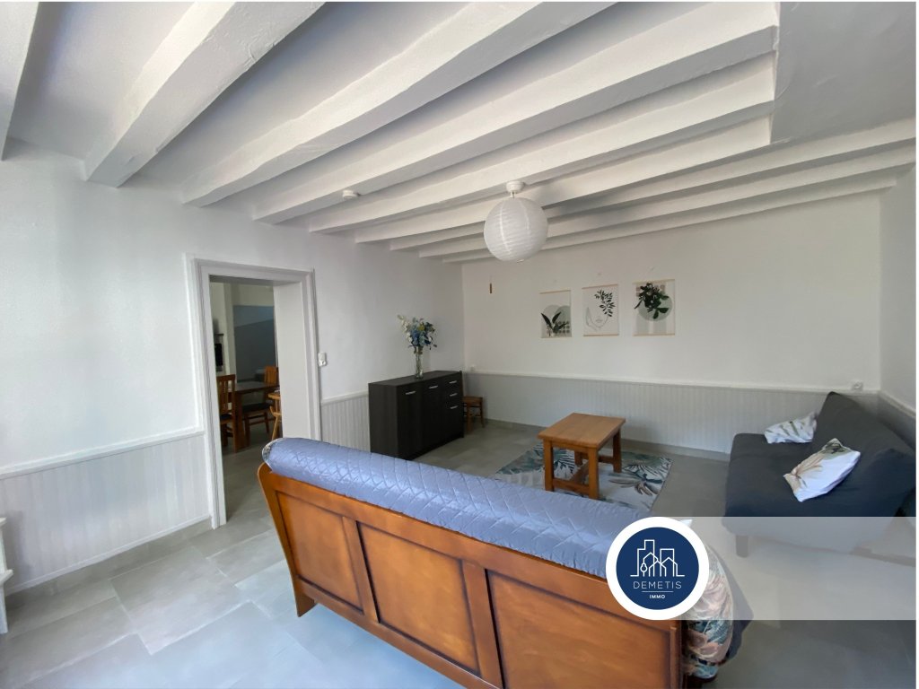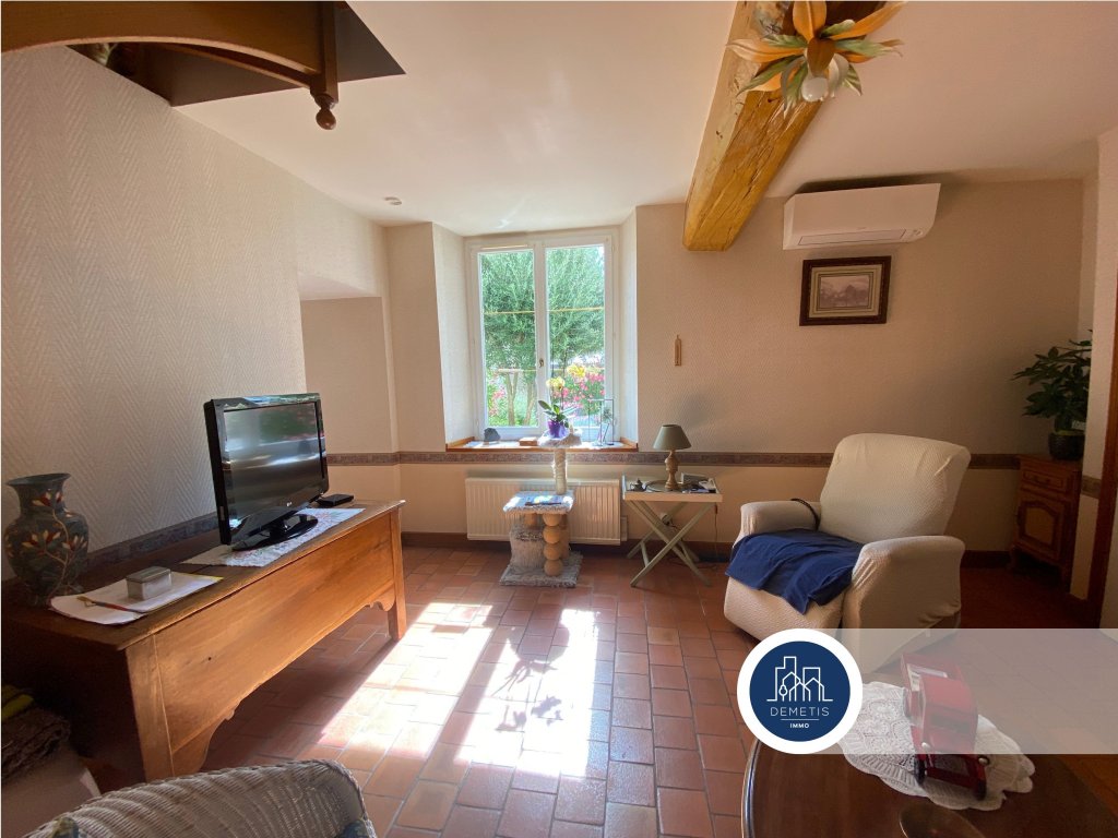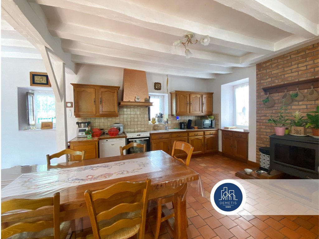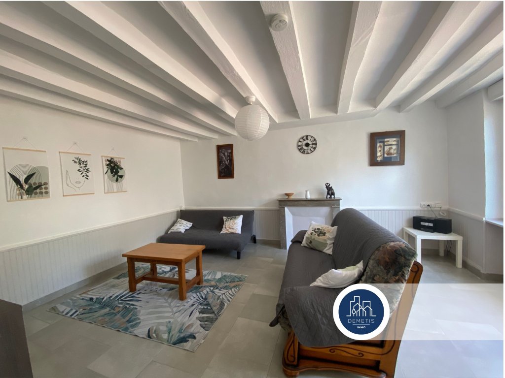 Au rez-de-chaussée : Une pièce de vie avec sa cuisine aménagée et équipée, un grand salon avec ses poutres, une salle d’eau, un wc séparé et une cave.